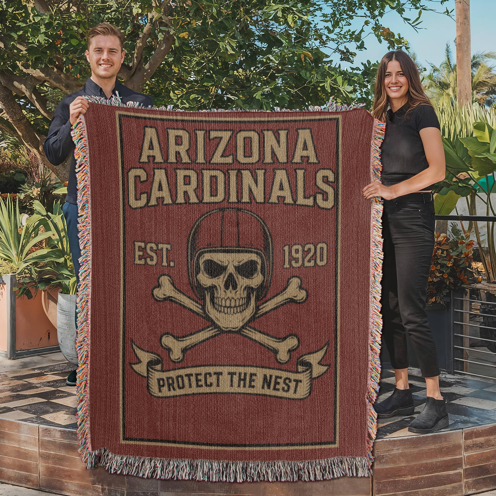 Represent the Red Sea with this Arizona Cardinals “Protect The Nest” woven blanket, designed for fans who defend their turf with pride. Featuring a fierce skull in a Cardinals-style helmet, bold ARIZONA CARDINALS lettering, crossed bones, and a vintage banner, this blanket delivers the grit, toughness, and loyalty that define true Cardinals fans.