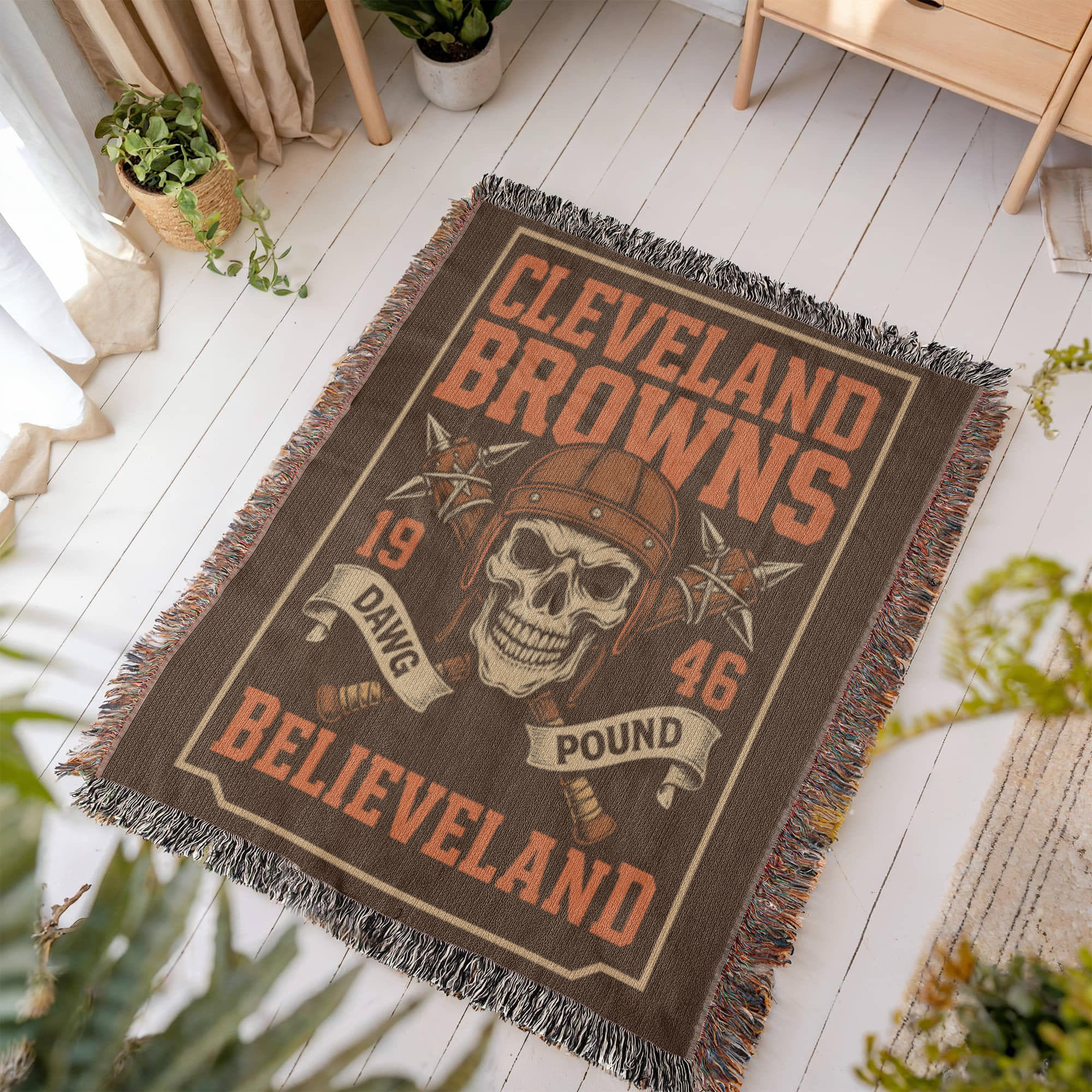 Featuring bold orange-and-brown coloring, the team’s founding year 1946, and the iconic BELIEVELAND motto, this throw brings the full spirit of Cleveland football into your home. The design is printed in high detail on a premium woven tapestry texture, giving it a warm, durable, handcrafted feel.