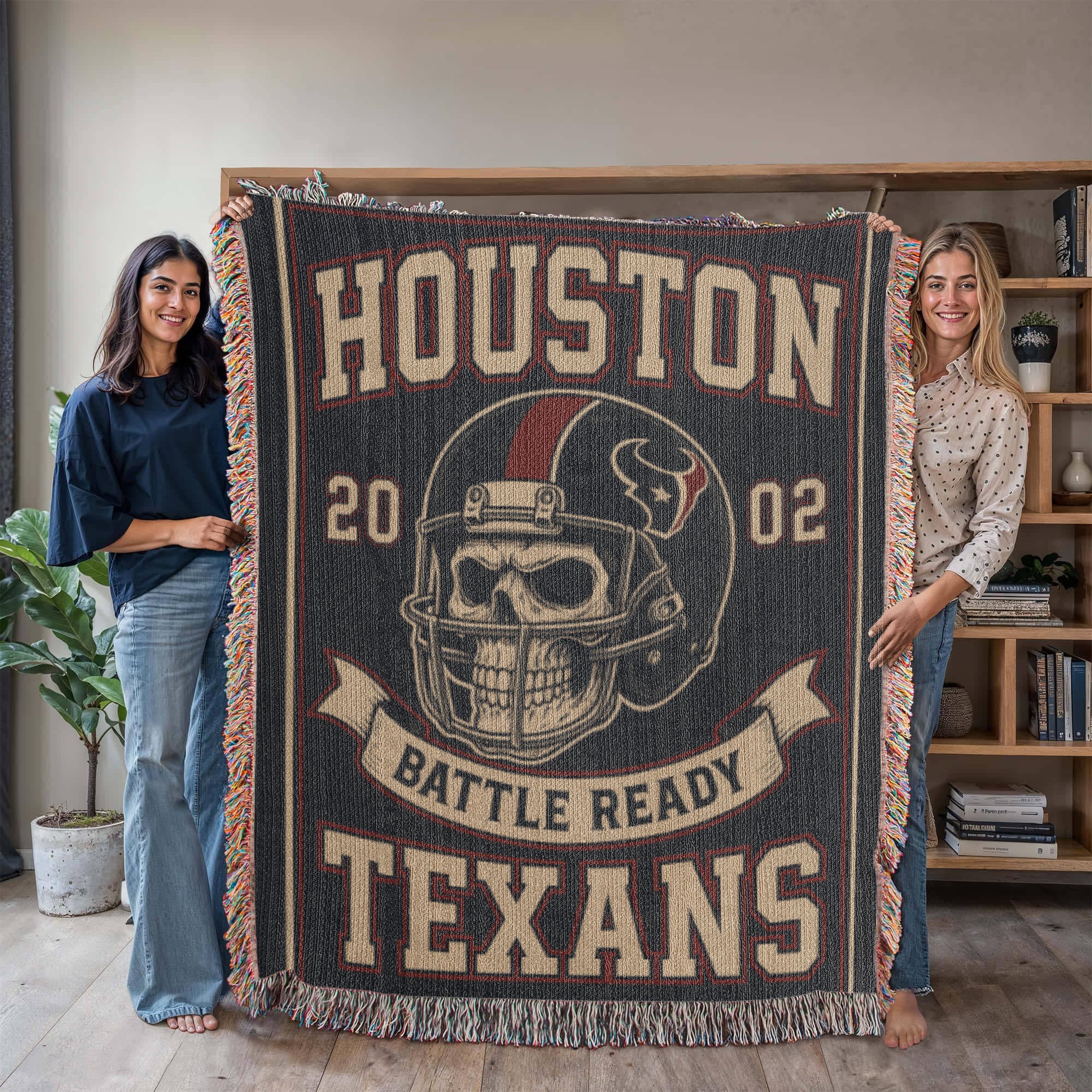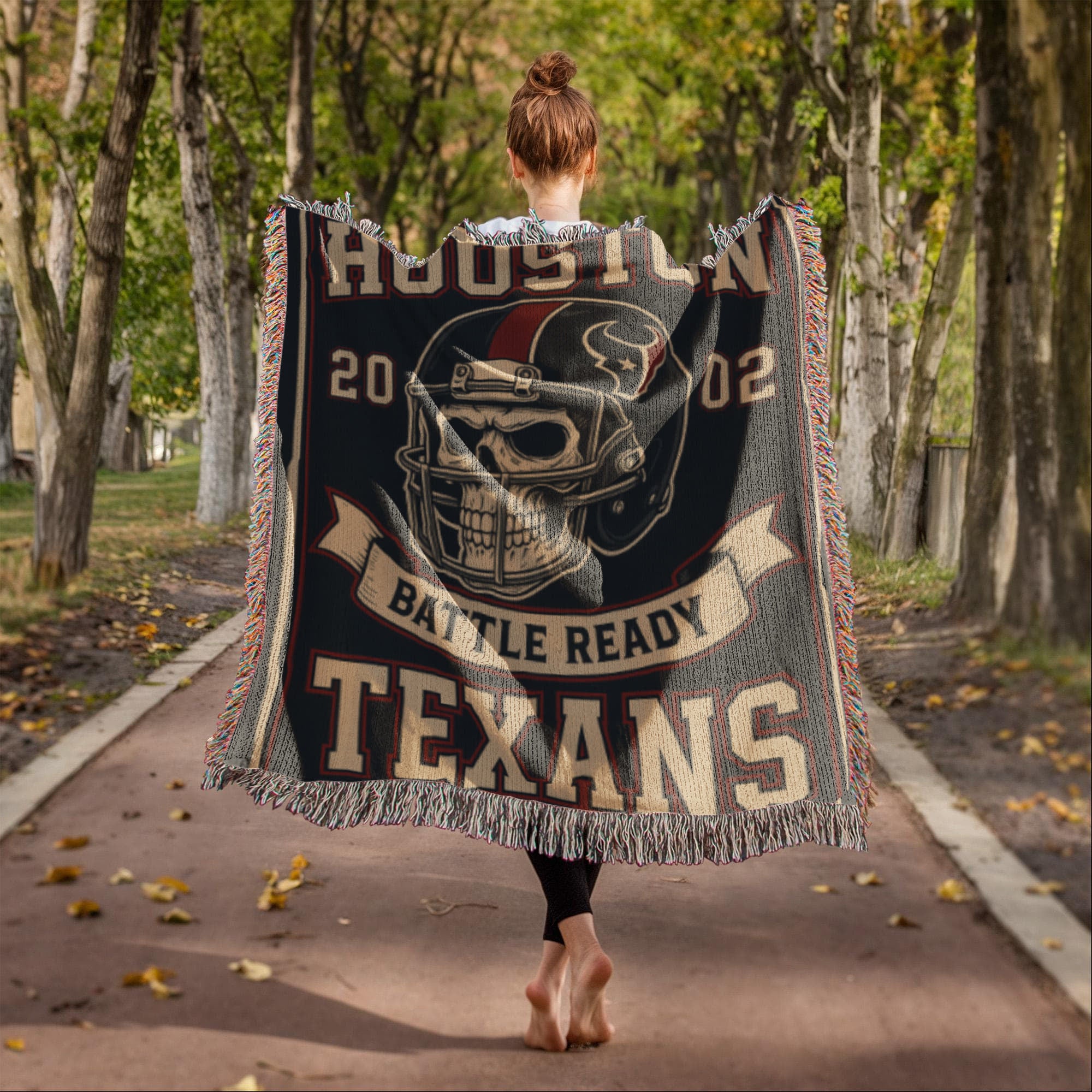 The blanket showcases the Texans’ founding year, 2002, along with a bold Battle Ready banner — a rally cry for every fan who stands strong through the highs and lows. The deep navy background, red accents, and cream details pop beautifully on the premium woven tapestry texture, giving it a rugged, durable, and high-quality feel.