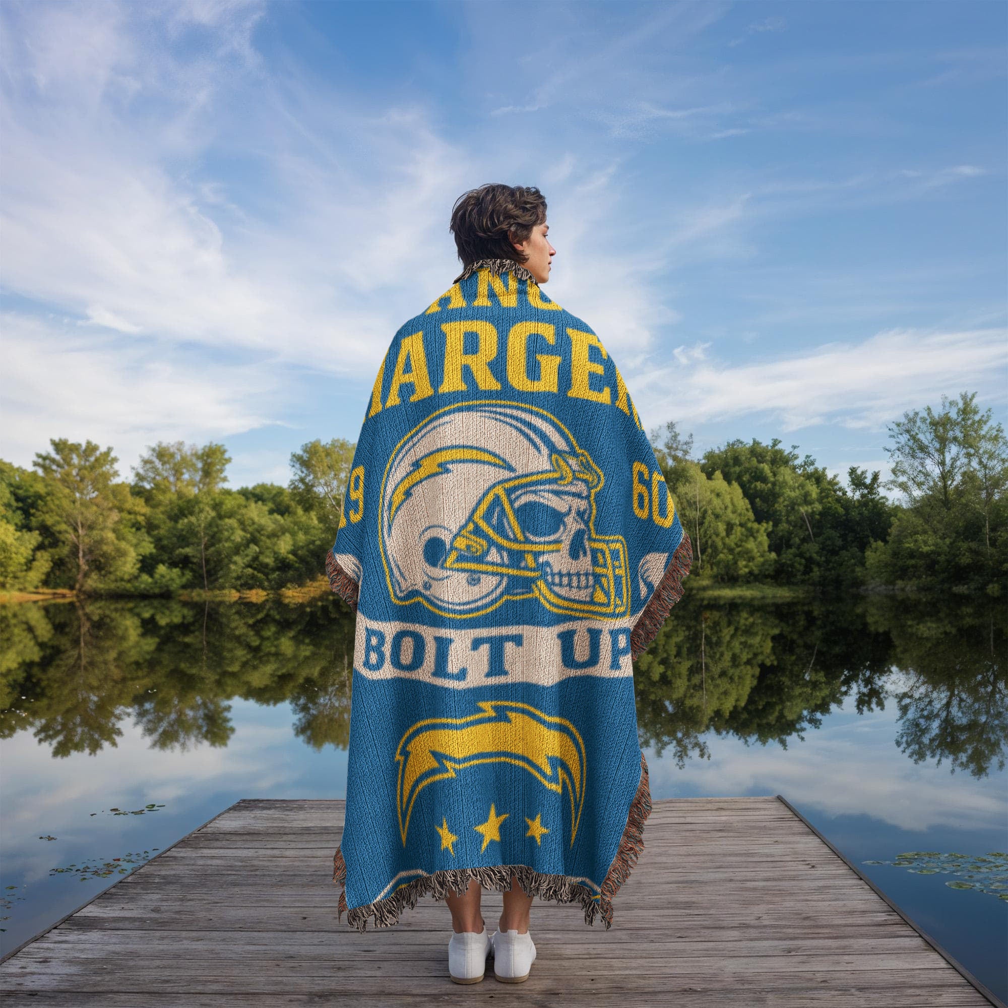 Bring the electric energy of Los Angeles football into your home with this exclusive Chargers “Bolt Up” woven blanket. Featuring a fierce skull wearing a Chargers-style helmet with gold detailing, this design crackles with bold blue-and-yellow team spirit.
