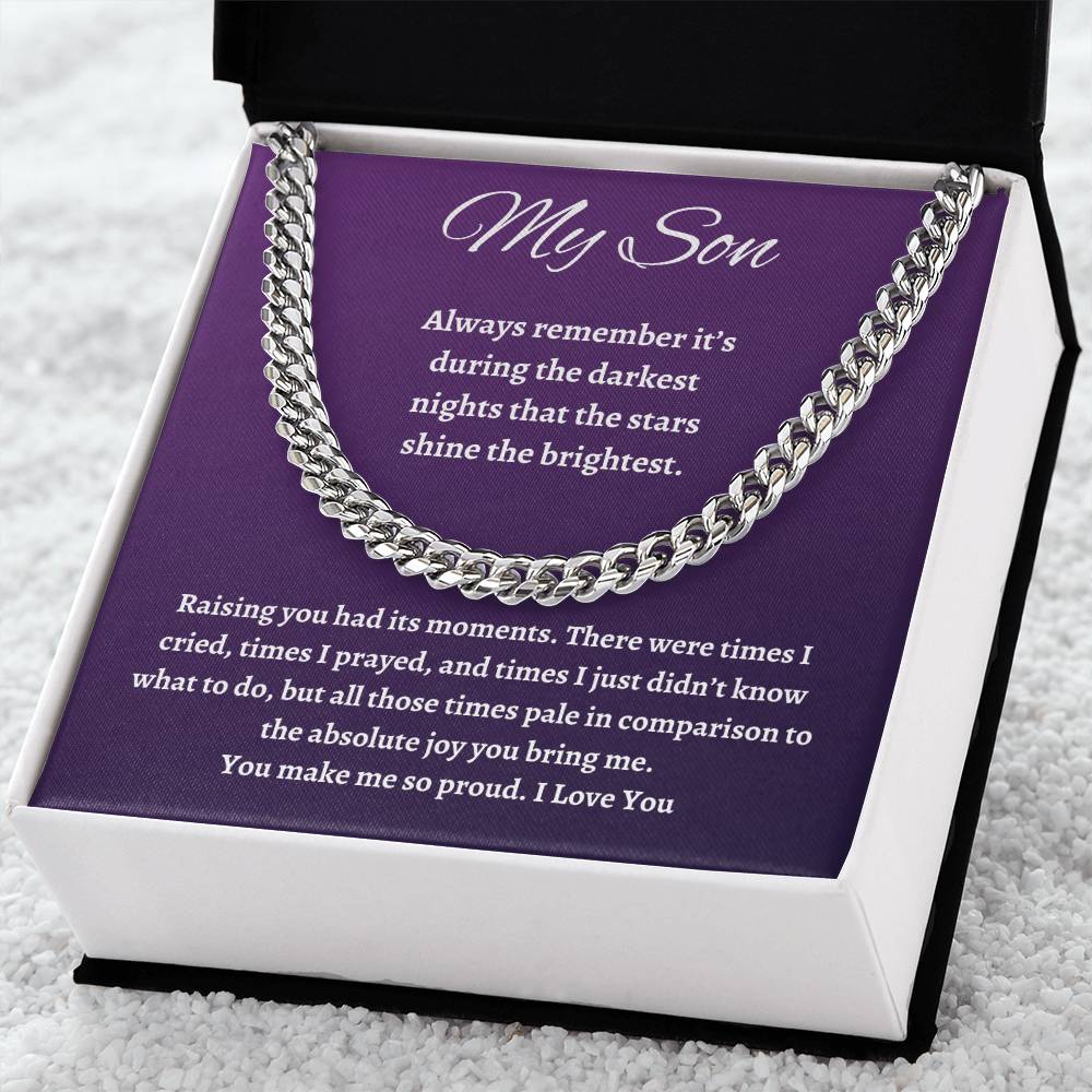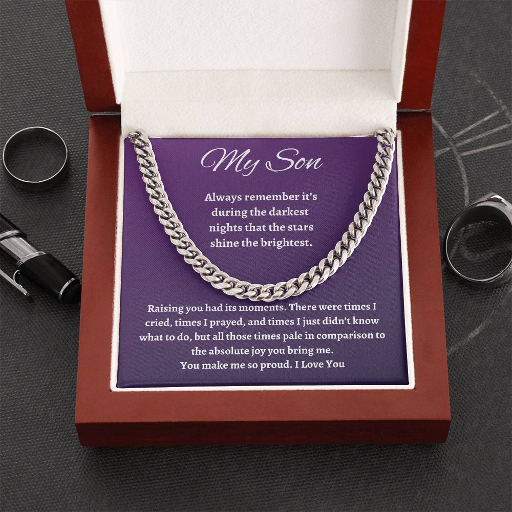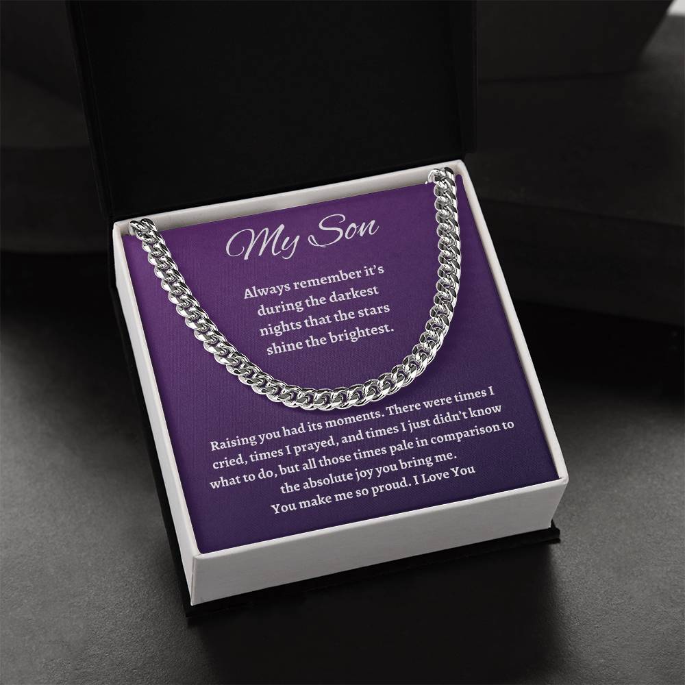 Always Remember it's during the darkest nights that the stars shine the brightest. Raising you had its moments, There were times I cried, times I prayed, and times I just didn't know what to do, but all those times pale in comparison to the absolute joy you bring me. You make me so proud. I Love You.