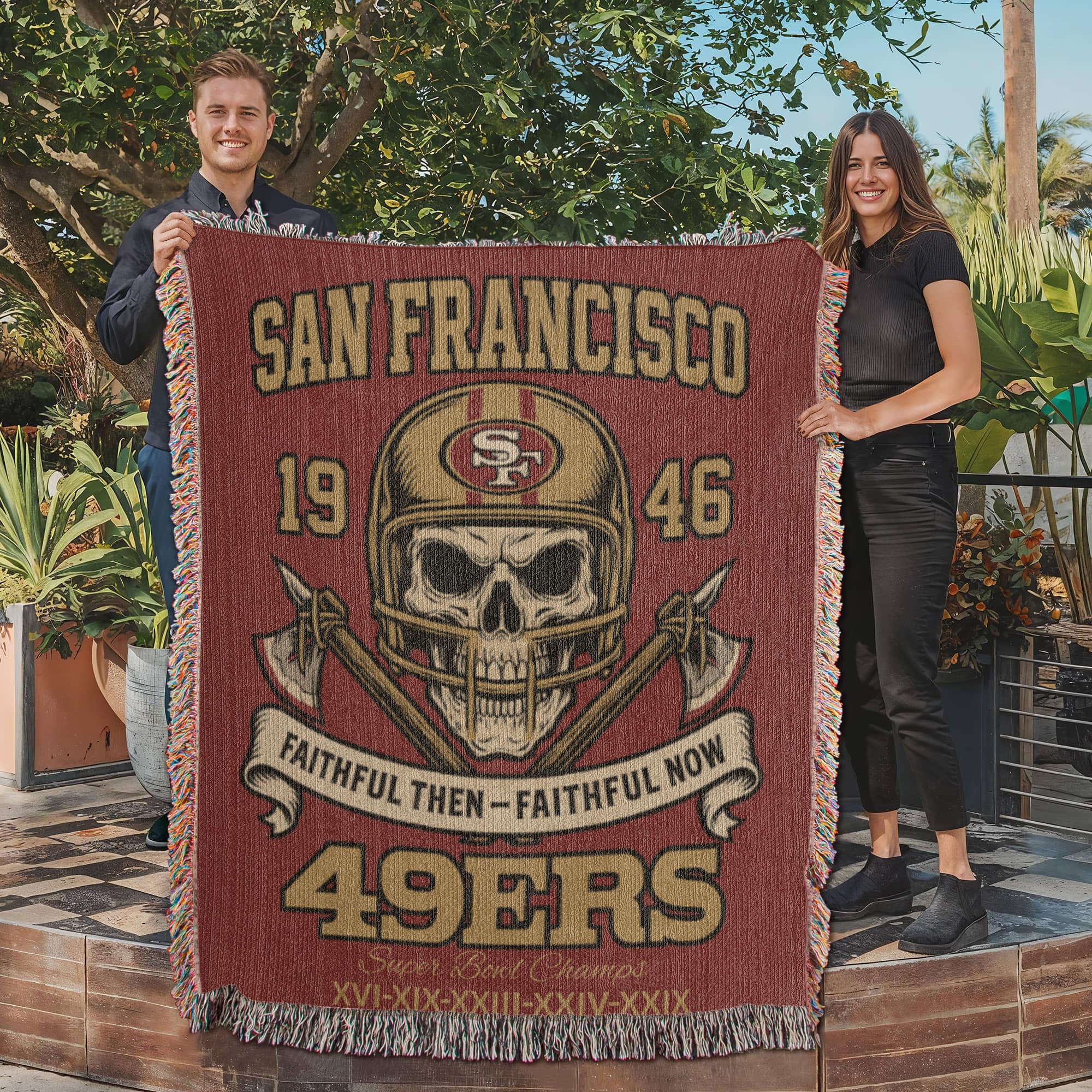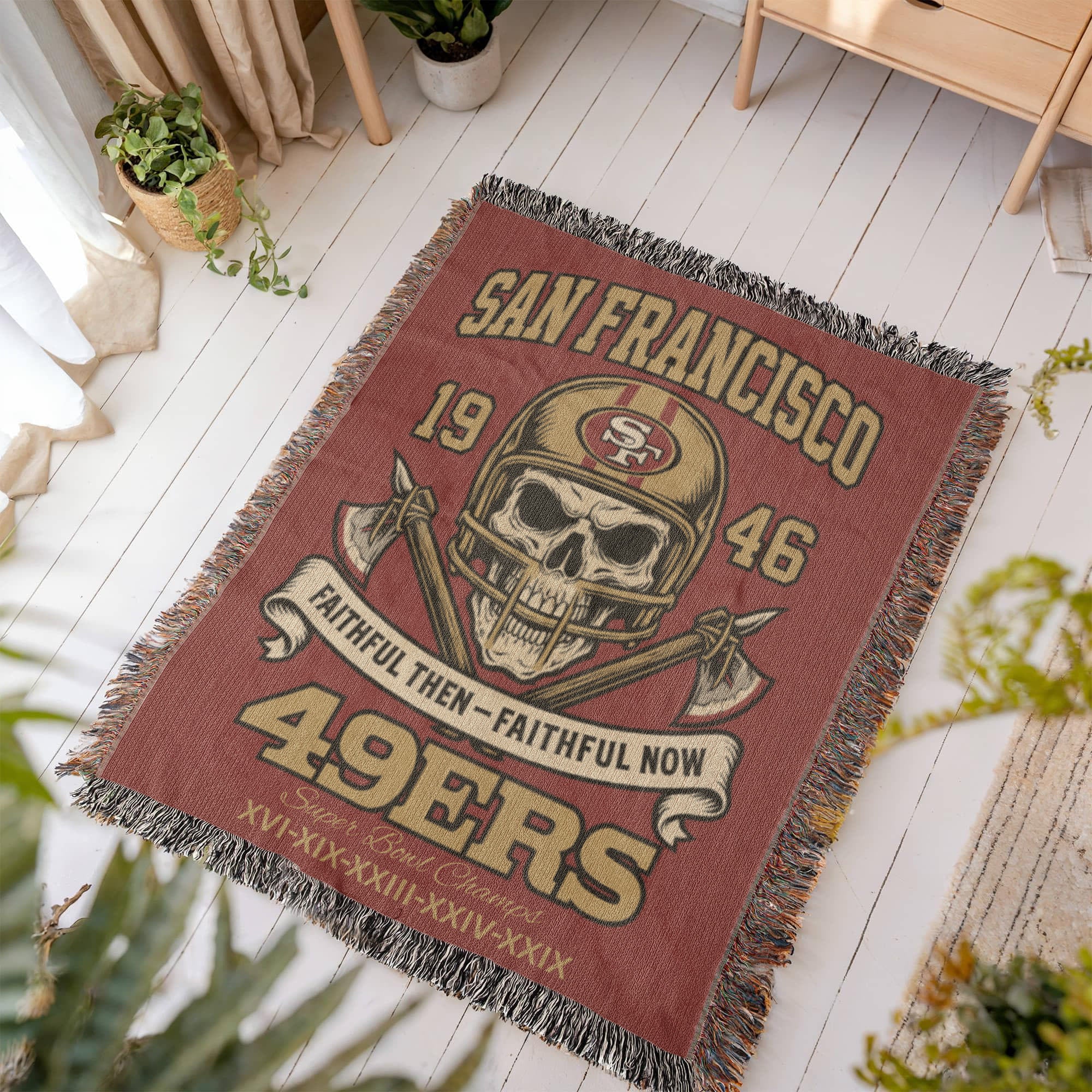 Honor the tradition of the San Francisco 49ers with this powerful “Faithful Then – Faithful Now” woven blanket, designed for fans who stand with their team through every era. Featuring a striking skull in a classic 49ers helmet, crossed axes, bold SAN FRANCISCO lettering, and five Super Bowl championships, this blanket is the ultimate statement of loyalty and pride.