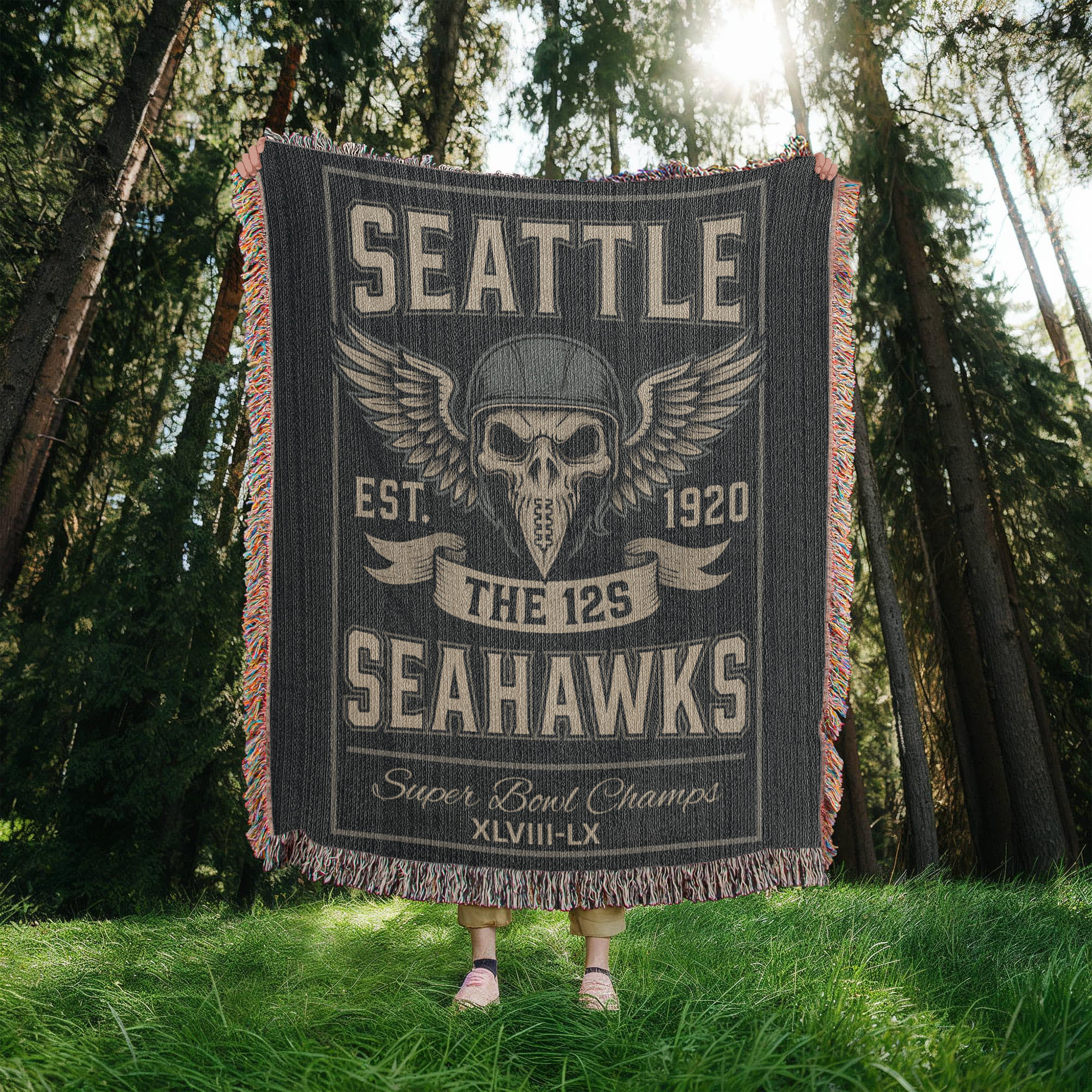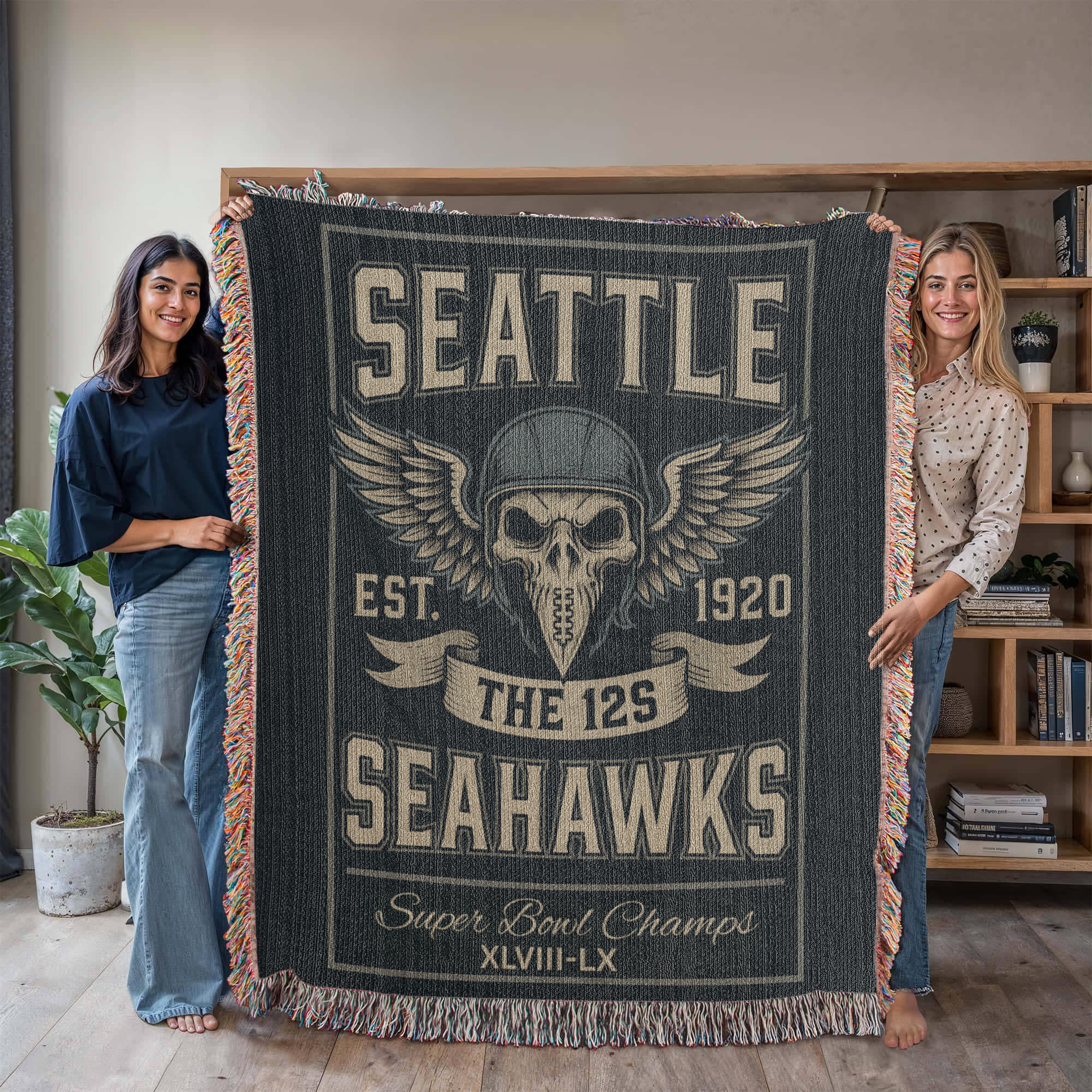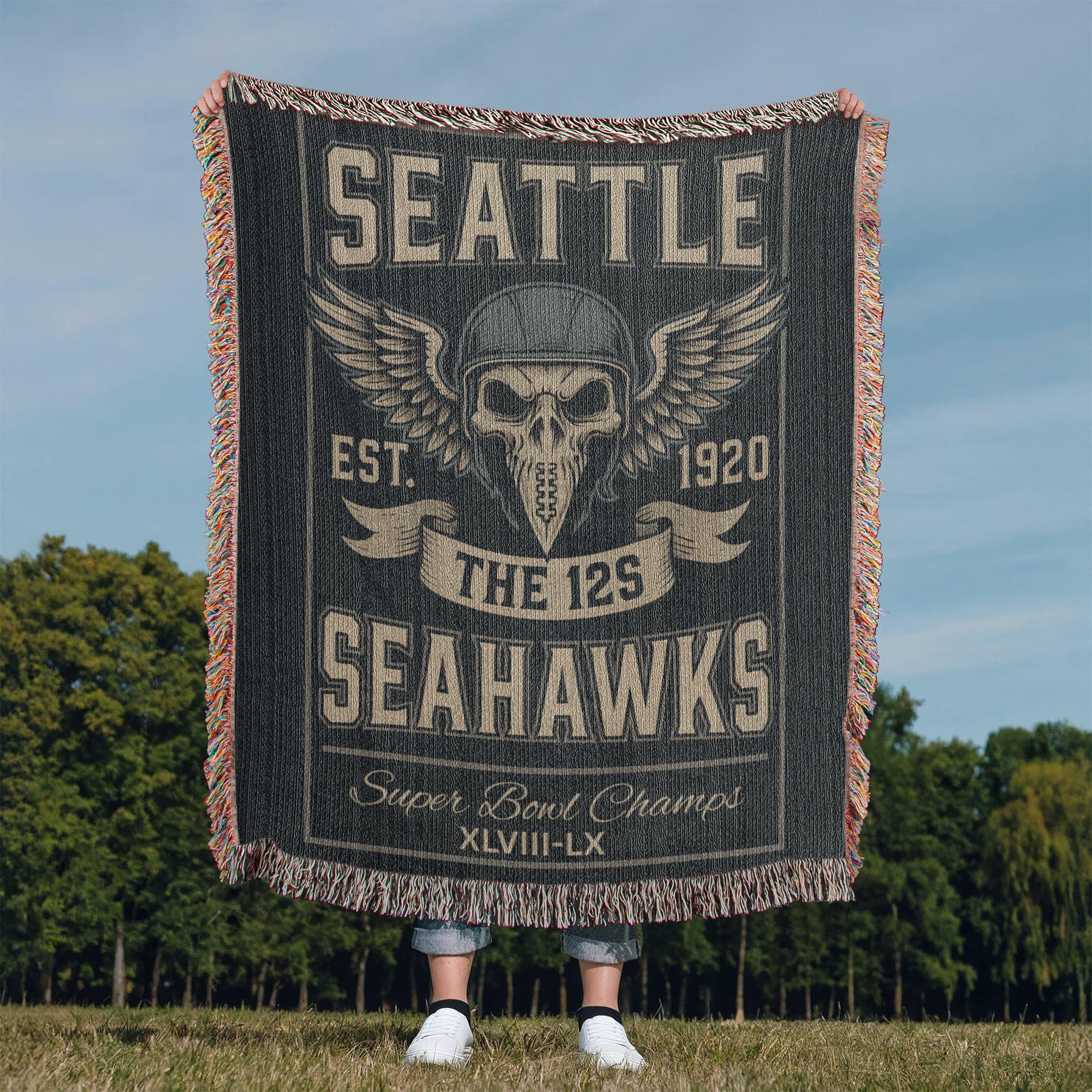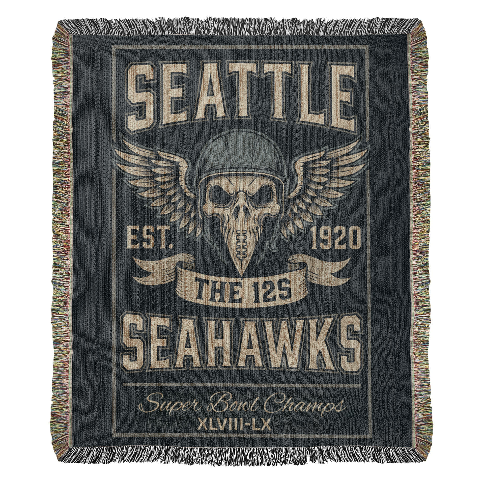 Honor the legendary 12th Man with this Seattle Seahawks “The 12s” woven blanket, designed for fans who bring unmatched passion to every game. Featuring a fierce skull-in-helmet graphic with powerful wings, bold SEATTLE lettering, and a classic vintage layout, this blanket embodies the strength, loyalty, and unstoppable energy of Seahawks Nation.