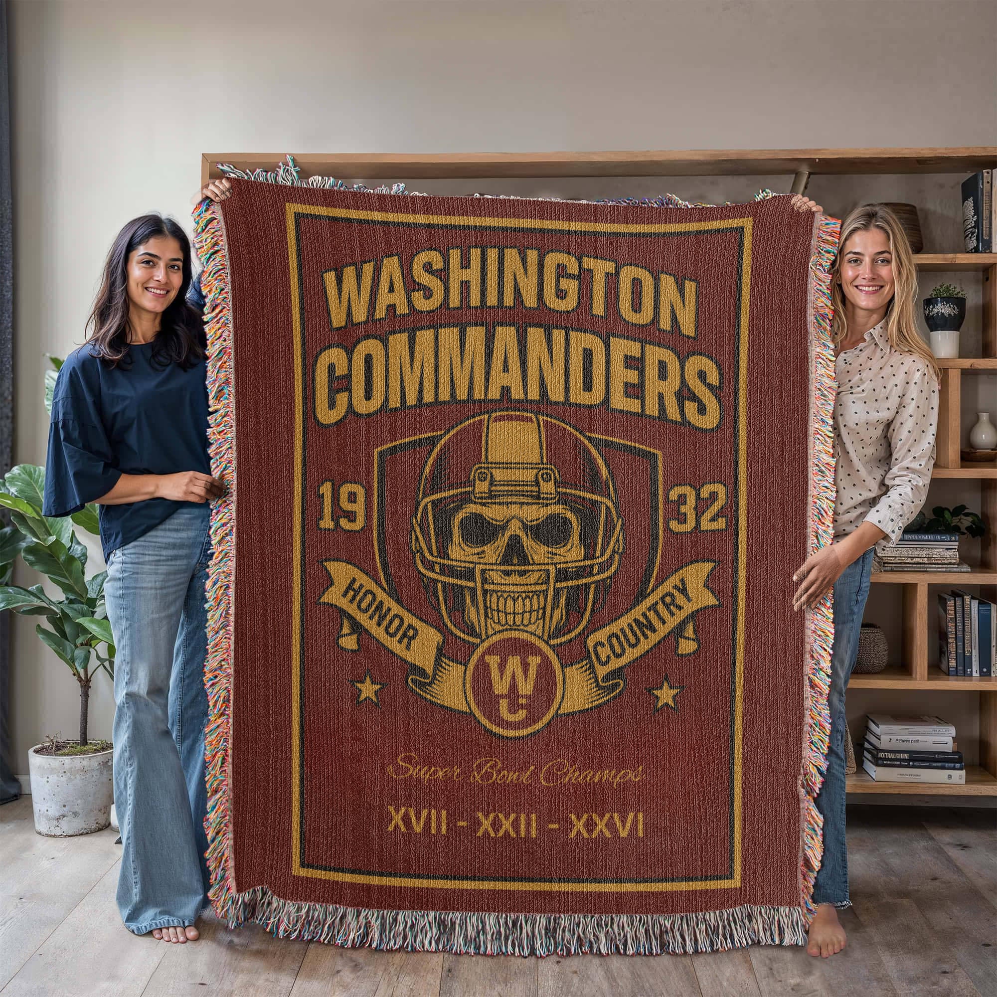 Wrap yourself in the legacy of Washington football. This exclusive woven blanket features an intimidating skull-helmet centerpiece, surrounded by vintage-style lettering and the iconic burgundy-and-gold color palette. Designed for fans who bleed Washington colors, this heavyweight throw celebrates the Commanders’ proud history — including their championship victories in Super Bowls XVII, XXII, and XXVI.